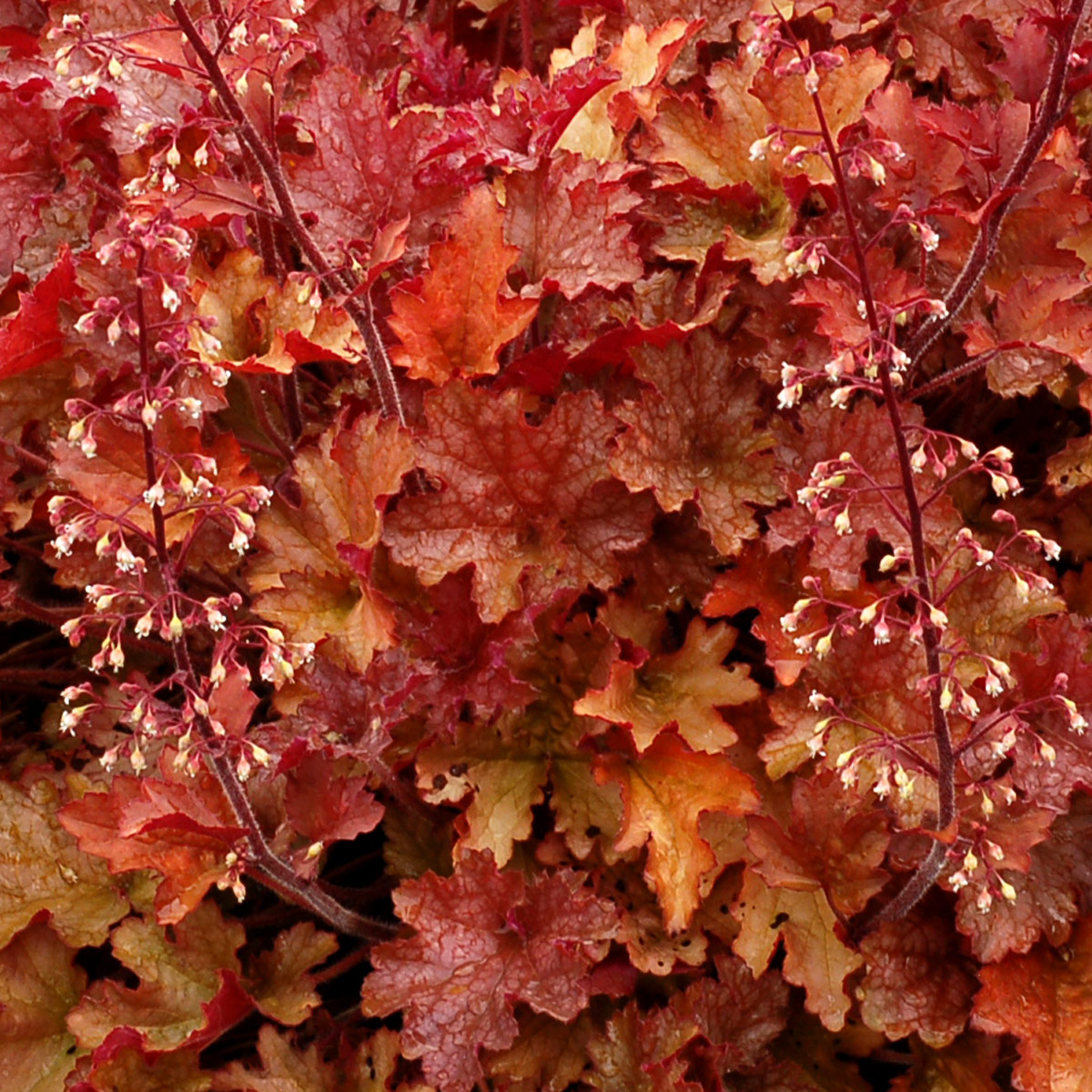 Гейхера Gingеr реасh – яркий, нарядный многолетник с кудрявыми, гофрированными листьями самых разных оттенков оранжевого. В процессе формирования кусты приобретают персиковые, коралловые, медные, желто-красные краски, что делает их особенно декоративными. На таком ярком фоне отлично смотрятся маленькие белые цветки, распускающиеся в июне–июле. Из-за резных, с хорошо заметными прожилками листьев розетка получается крупная и фактурная. Растение весь сезон сохраняет свой декоративный вид и быстро растет на слегка влажных и плодородных почвах. Любит селиться в полутени, но не чувствует себя угнетенным и на жарком солнце.