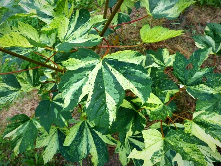 Внимание привлекают листья во время их распускания. В этот период они ярко-розовые с желтовато-розовыми пятнами, но очень быстро становятся зелеными с белыми и желтыми пятнами и полосами (иногда появляются пятна розового цвета). Позже листья становятся зелеными с многочисленными разноцветными крапинками.