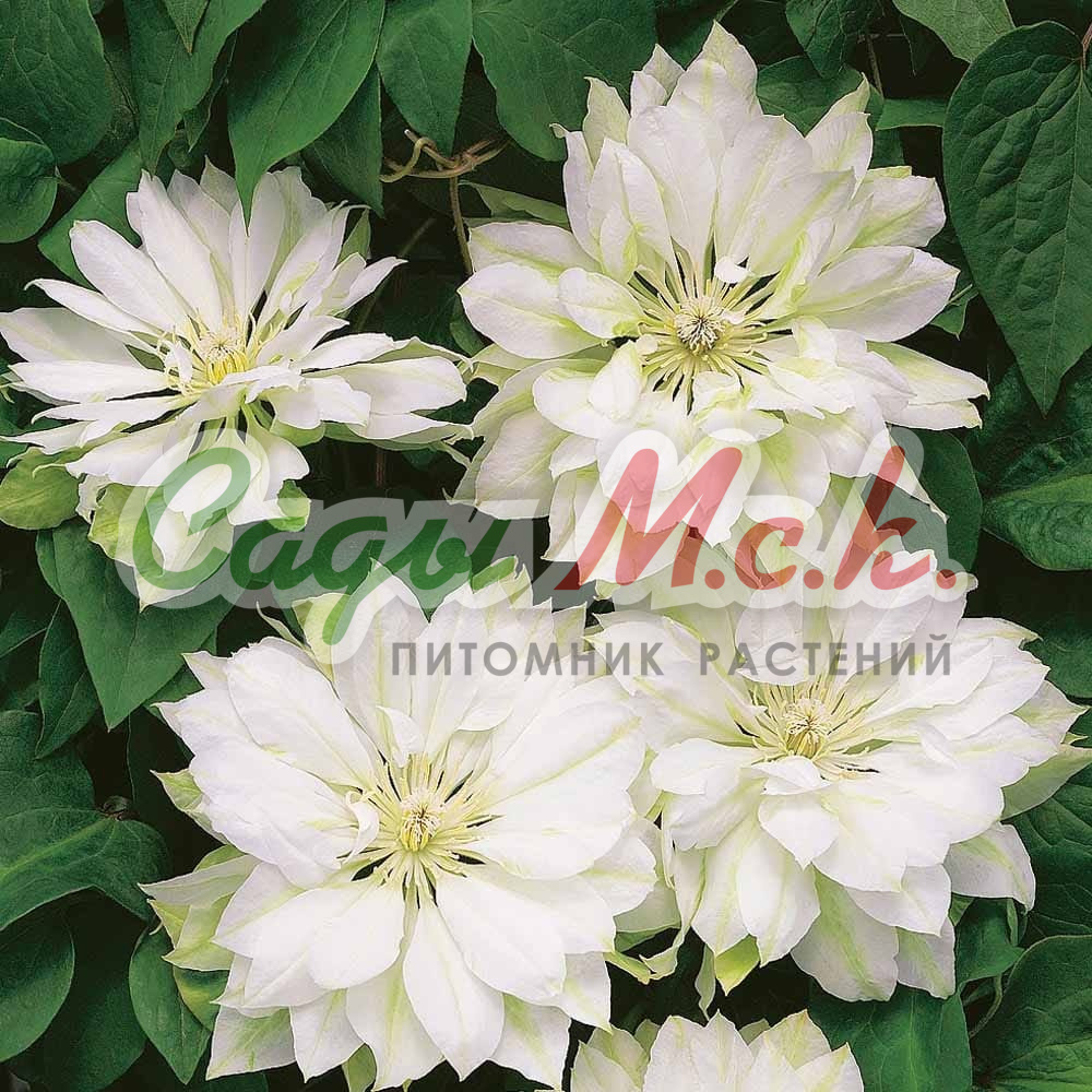 Восхищает белыми, причудливо закрученными чашелистиками, в виде чаши. Цветёт весной и поздним летом. Цветки большие, диаметром 12–14 см, всегда махровые, состоящие из 30–50 в разные стороны перекрученных, свободно собранных, белых чашелистиков с зелёной полоской и основанием со время первого цветения. У тычинок жёлтые пыльники на лимонных нитках. Лиана до 2-2,5 м.