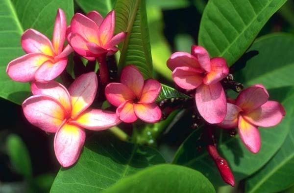 Plumeria Keiki - декоративное растение. Листья продолговатые, заостренные, насыщенно-зеленые, глянцевые. Цветки маленькие, светло-розовые с розовой каймой лепестков и красно-желтым основанием. Лепестки продолговатые, слегка завернутые внутрь.
